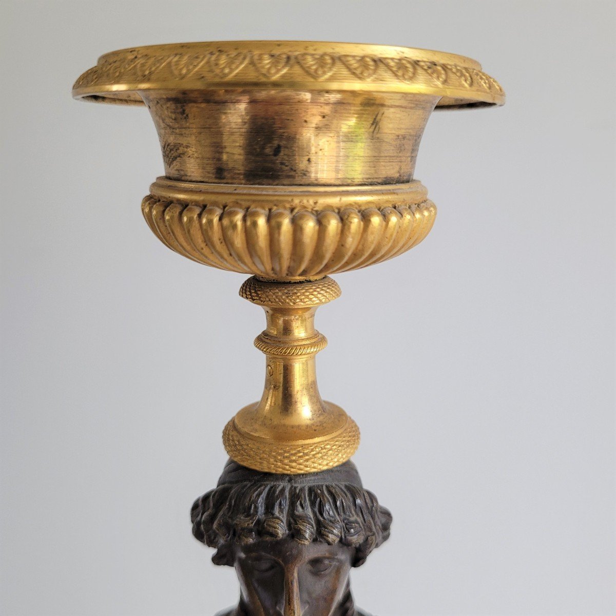 Paire de candélabres à trois lumières en bronze patiné et bronze ciselé et doré au mercure.