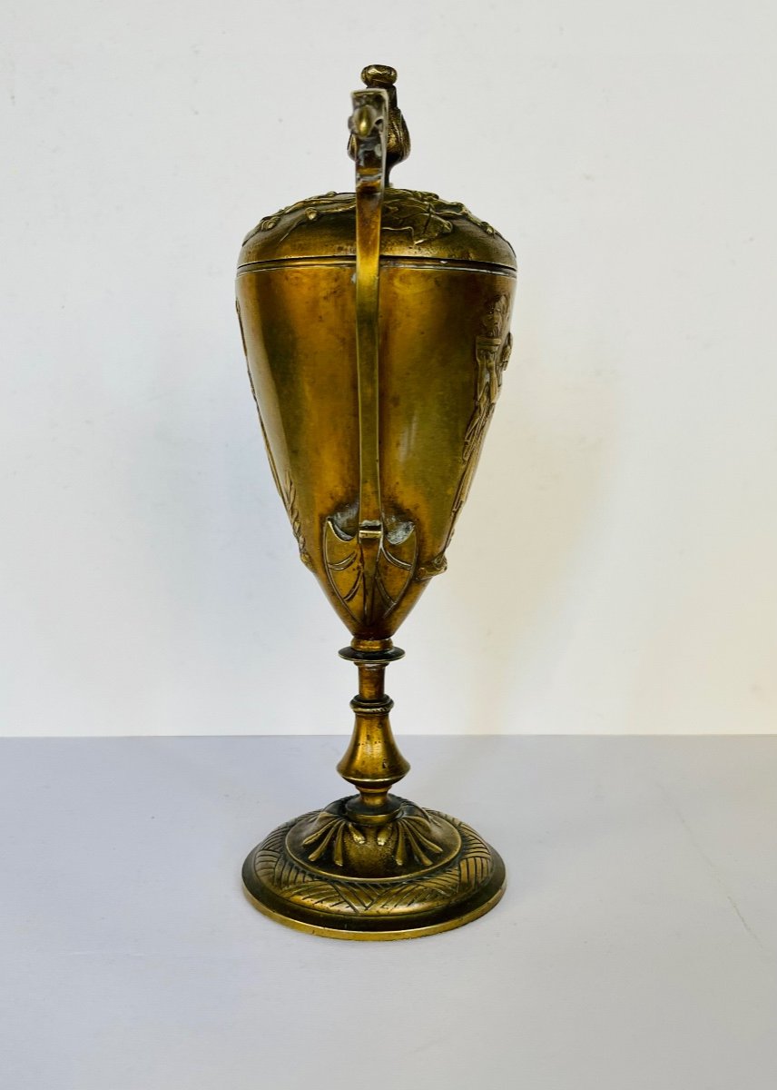 Vase en bronze doré en forme d'amphore sur piètement et fermé par un couvercle. Deux anses le complète qui se terminent en tête d'aigle. La panse est décoré à deux représentations à l'antique, l'une masculine, l'autre féminine. Le couvercle est décoré d'une branche enroulée et de feuillage.