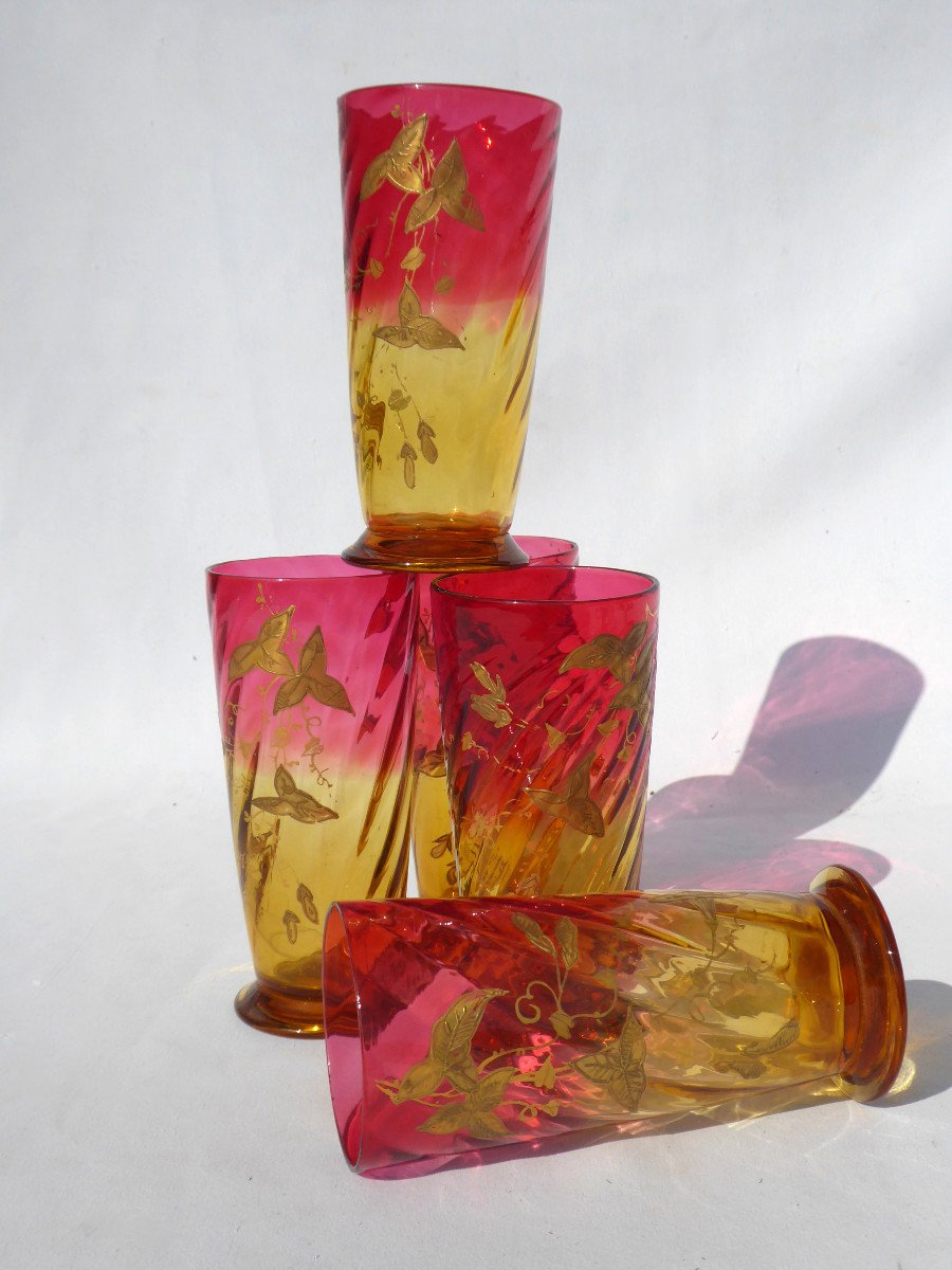 Serie De 5 Verres / Gobelets A Orangeade En Cristal Art Nouveau Email XIXe Legras Baccarat