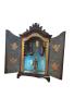 L’intérieur est peint, rehaussé de feuilles d’or comportant de petites étagères permettant la présentation de petites sculptures votives.