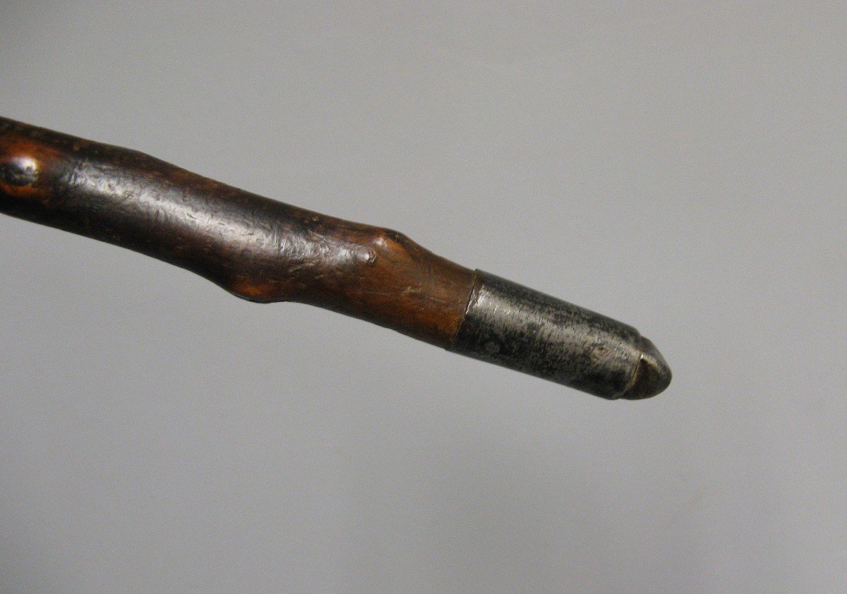 Canne d'ard. Canne de défense avec système appelé « Styletto » ou « Dard » et marteau. Le pommeau en forme de marteau et de crochet est muni d'une valve centrale de fermeture d'où est éjectée par inertie une lame de 14 cm à section quadrangulaire, maintenue par deux encoches latérales. Le canon est en bois épineux. La tige entière mesure 93 cm. France, seconde moitié du XIXe siècle. Mention obligatoire : arme de catégorie D, vente libre aux plus de 18 ans.