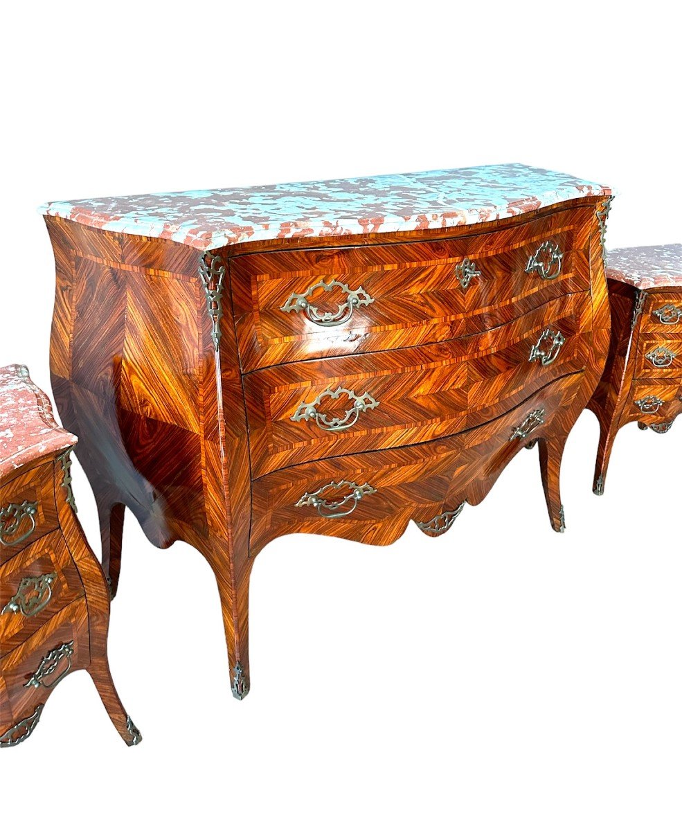 Elégant Triptyque composé d'une commode et de deux chevets, en bois et plaqué d'ébène, de style Louis XV réalisé dans la seconde moitié du XIXème siècle.