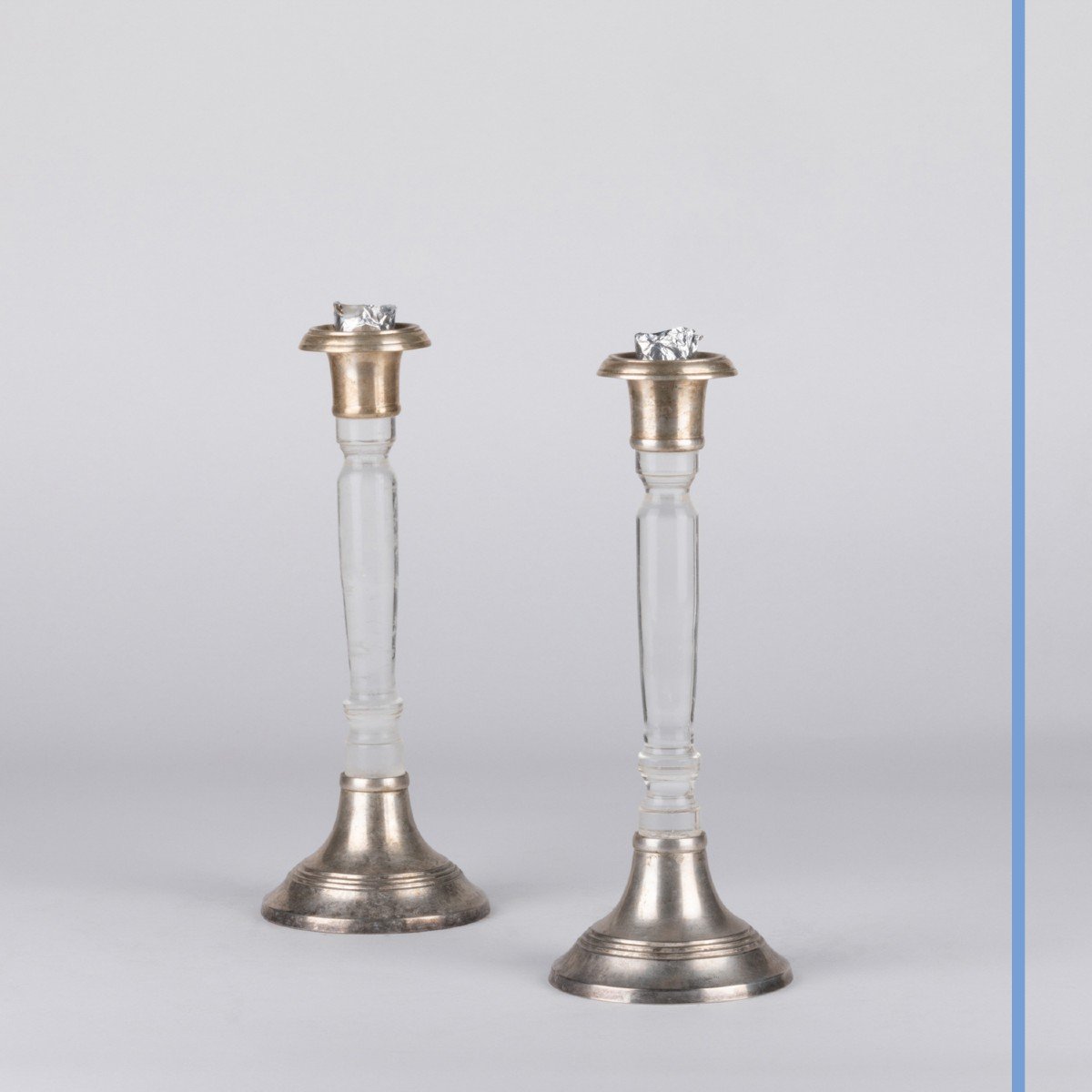 Jolie paire de bougeoirs en résine transparente et métal argenté.