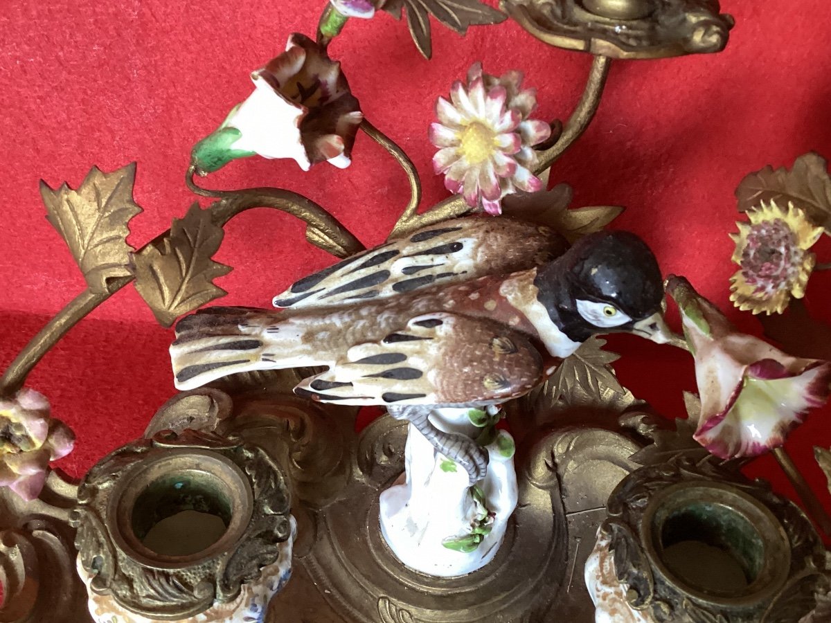 Bel encrier en bronze doré de style Rocaille à un bougeoir formant lumière, décor central un oiseau (petit manque au bout du bec), deux encriers en porcelaine à décor de fleurs polychromes, le tout surmonté d'un feuillage en laiton doré à décor de fleurs (quelques manques), à nettoyer.
