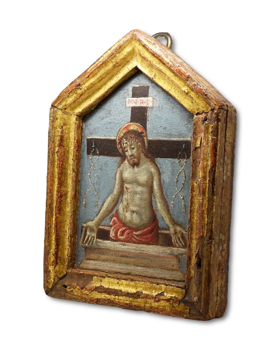La peinture à fond bleu représente l'image du Christ debout dans son tombeau, ses paumes ouvertes à ses côtés et le crucifix derrière lui.