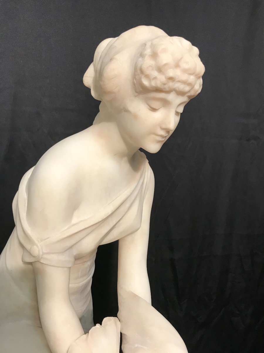 "Sculpture albâtre jeune fille pigeon voyageur par Pittaluga Carlo"