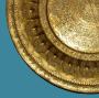 Laiton épais et lourd, gravé au burin de fins décors de 22 niches à cabochons, rosaces, deux autres frises de niches vers l'intérieur, décor de feuillages et de fleurs.