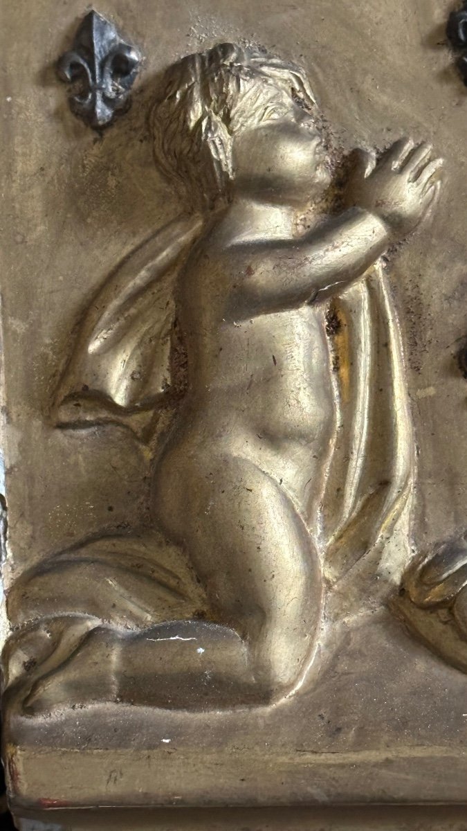 Splendide bas-relief en bois, doré à la feuille d'or et d'argent.