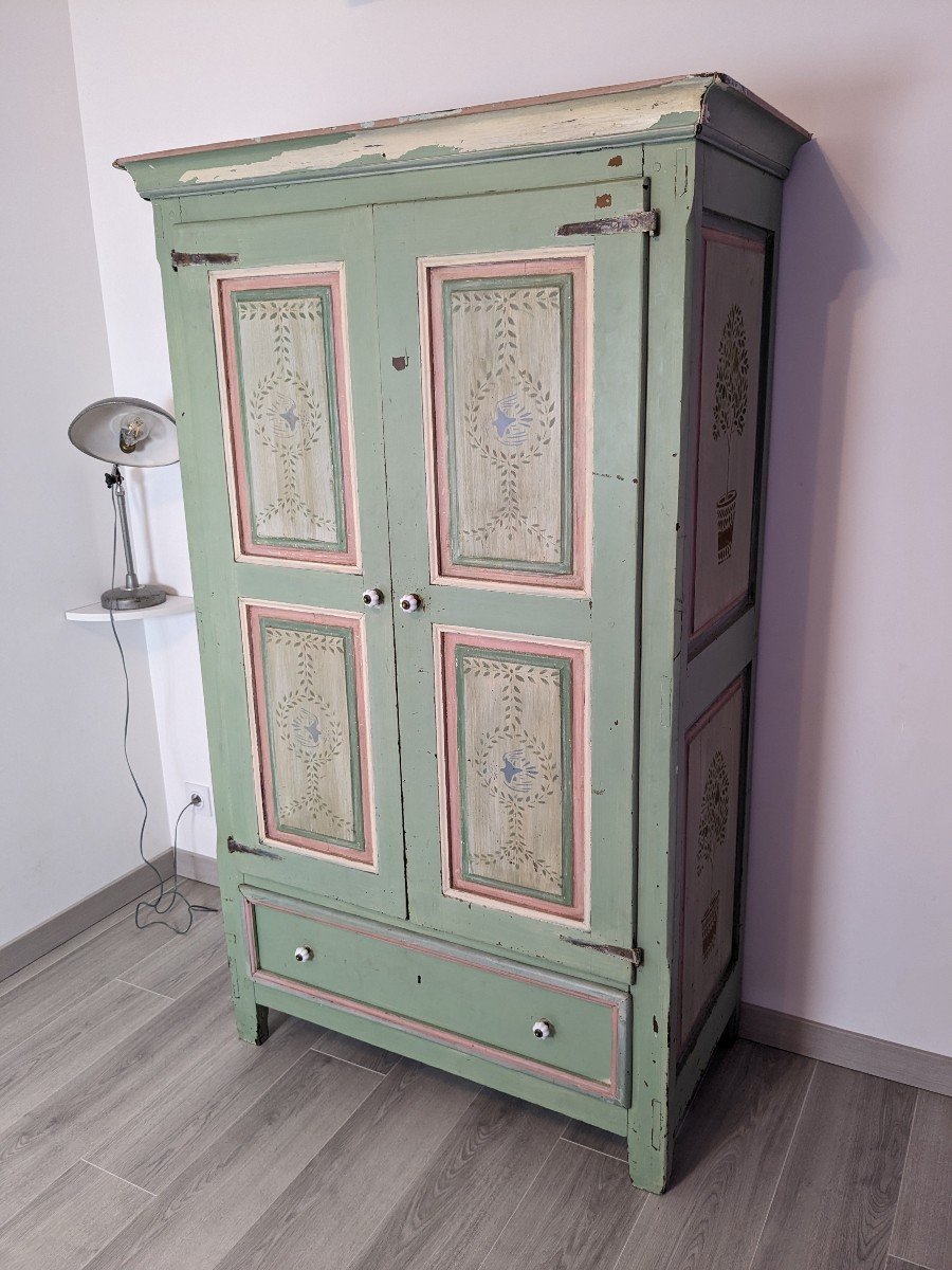 Elle a été peinte en vert pâle, avec des décors fleuris rouge et blanc, mais on peut voir l'ancienne peinture blanche sur la partie haute et par endroits.