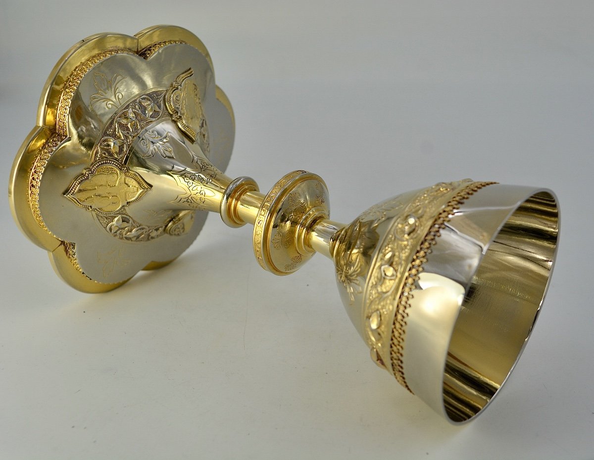 Calice en argent et argent doré. Style néogothique. Il repose sur une base polylobée dont la tranche est agrémentée d’une frise d’arcatures. La base, soulignée d’un bandeau de feuilles entrelacées, reçoit trois médaillons à six lobes redentes représentant la Vierge Marie, le Christ crucifié et le Christ en majesté. Tige tubulaire à collerette, semée de feuilles d’acanthe ciselées. Noeud est de forme torique à filets, décoré de feuilles d’acanthe enrubannés, il porte l'inscription latine : ""Ego sum/(…)/Palmiras"". L’ornement de la fausse-coupe reprend les motifs floraux représentés sur la base du calice. La coupe est dorée.