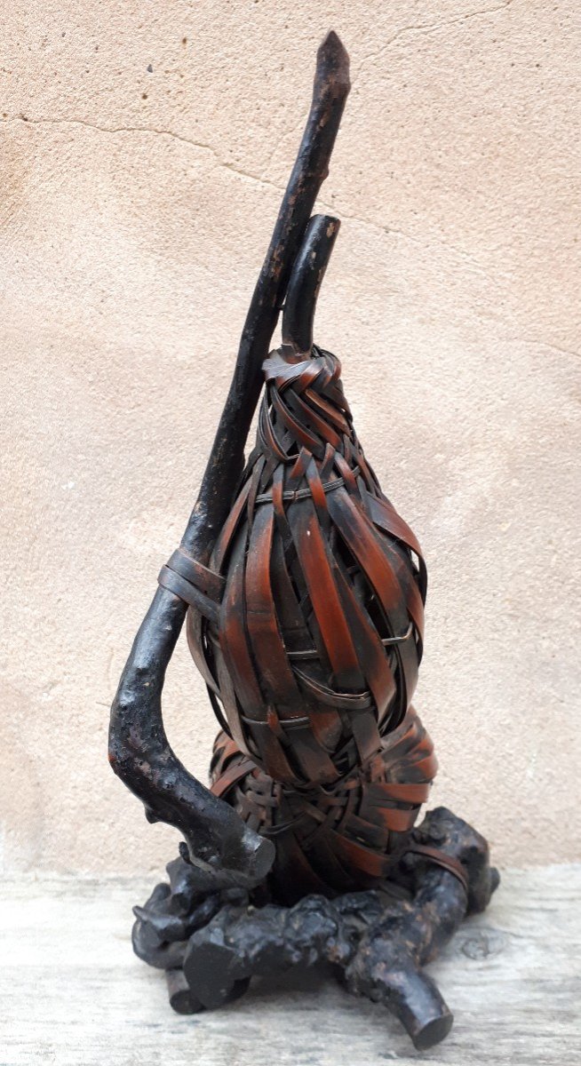 Rare panier en forme de calebasse (hyotan) en bambou fumé (suzudake) utilisé dans l'art traditionnel japonais de la composition florale (ikebana), attaché à un support en branches tortueuses.