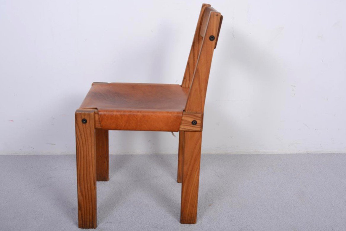 Chaise S24 de Pierre Chapo 1967Structure en orme massif, dossier bois, Le cuir d’assise est tendu par un astucieux tressage de cordes au-dessous (cordes récentes)Petite histoirePierre Chapo a dessiné cette chaise en 1967 pour son ami le docteur Hiroshi NakajimaIl a mis à l’honneur la force des assemblages à mi-bois d’angles pour assurer la rigidité d’une chaise à la ligne très épurée.Dimensions : Hauteur dossier 76 cm Profondeur43 cm Hauteur assises 45cm Largeur 41 cmRépertoriée dans l’ouvrage « Pierre Chapo » par Magen H gallery