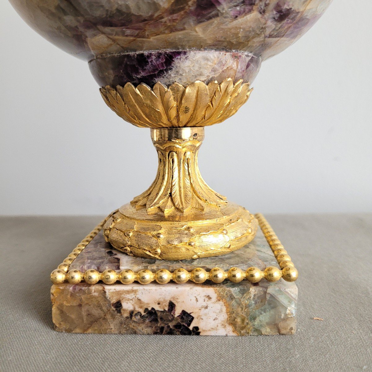 Paire de pots-pourris en spath-fluor et bronze ciselé et doré au mercure, à décor de feuilles de laurier, rangs de perles.