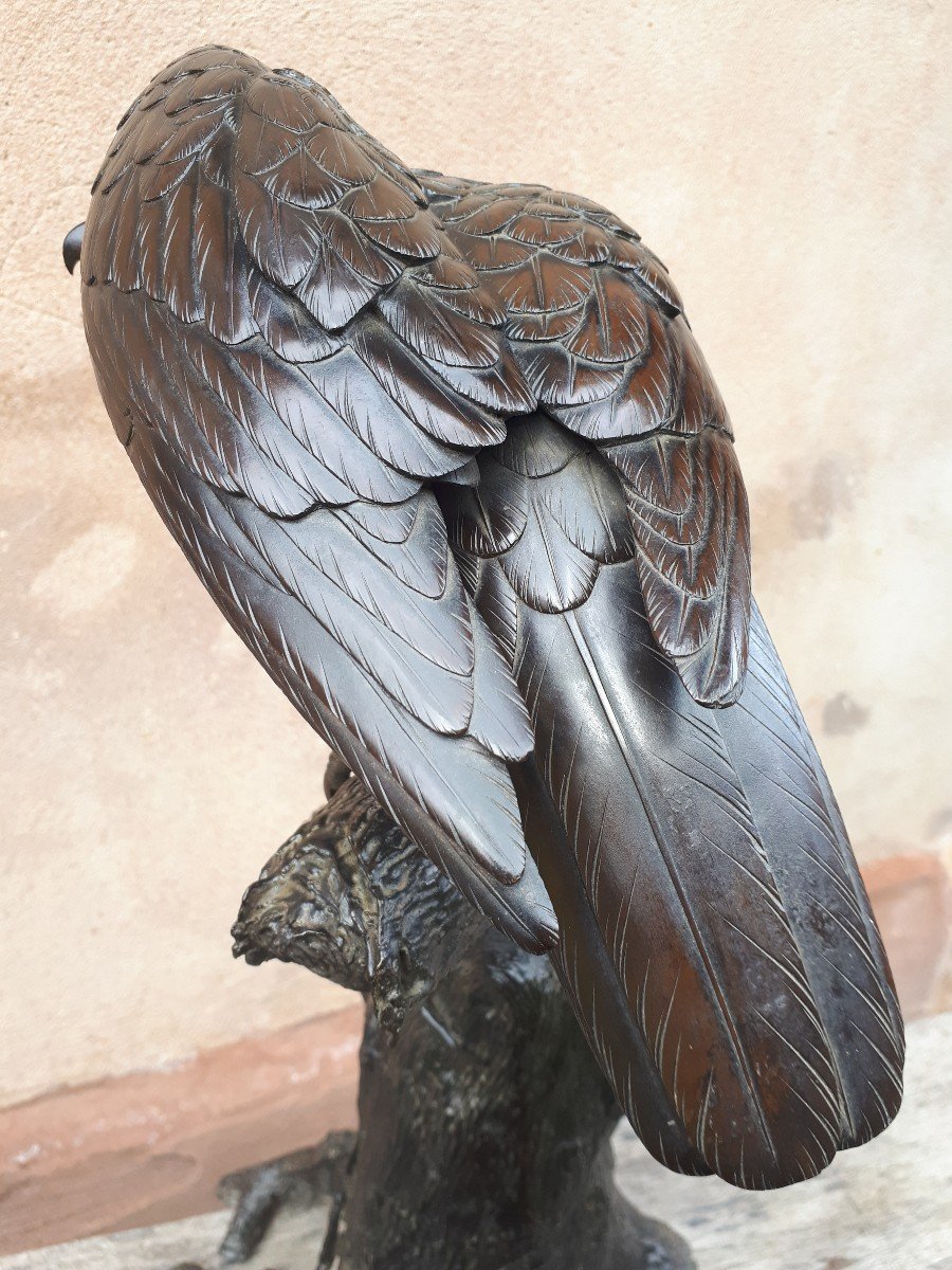 Cette sculpture est stupéfiante de réalisme : observez l'aspect un peu brut du tronc, qui ne semble être plus qu'une écorce enveloppant un corps inerte, en contraste avec le faucon au plumage lisse, presque doux, qui a été ciselé dans les moindres détails apparaissant ainsi plus vivant que jamais sur cet arbre mort. L'oiseau semble avoir repéré au loin sa proie, avec ses yeux perçants, traités en or et shakudo par l'artiste.