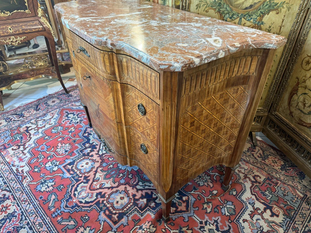Avec un décor d'attributs de musique, noeud Louis XVI et une riche marqueterie à la reine, face et sur les côtés, décor d'urne dans la traverse du bas,