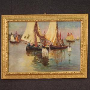 Peinture italienne de la première moitié du 20ème siècle. Oeuvre huile sur toile, sur la première toile, représentant une marine de style impressionniste, Vue avec bateaux et personnages de bonne qualité picturale. Cadre en bois et plâtre, sculpté, doré (teinte bronze) et ciselé de belle décoration. Cadre adapté à la peinture avec quelques signes de vieillissement (voir photo). Tableau de grand format et d'excellente luminosité signé et daté en bas à droite G. Morello 1926 (voir photo) signature en phase d'étude. Tableau agréablement décoré pour antiquaires, décorateurs d'intérieur et collectionneurs de peinture italienne du 20ème siècle. Peinture ayant subi une restauration conservatrice, reprise de couleur en certains points et taches placées au dos de la toile (voir photo). En bon état avec quelques signes de restauration. Mesure intérieure H 68 x L 98 cm.