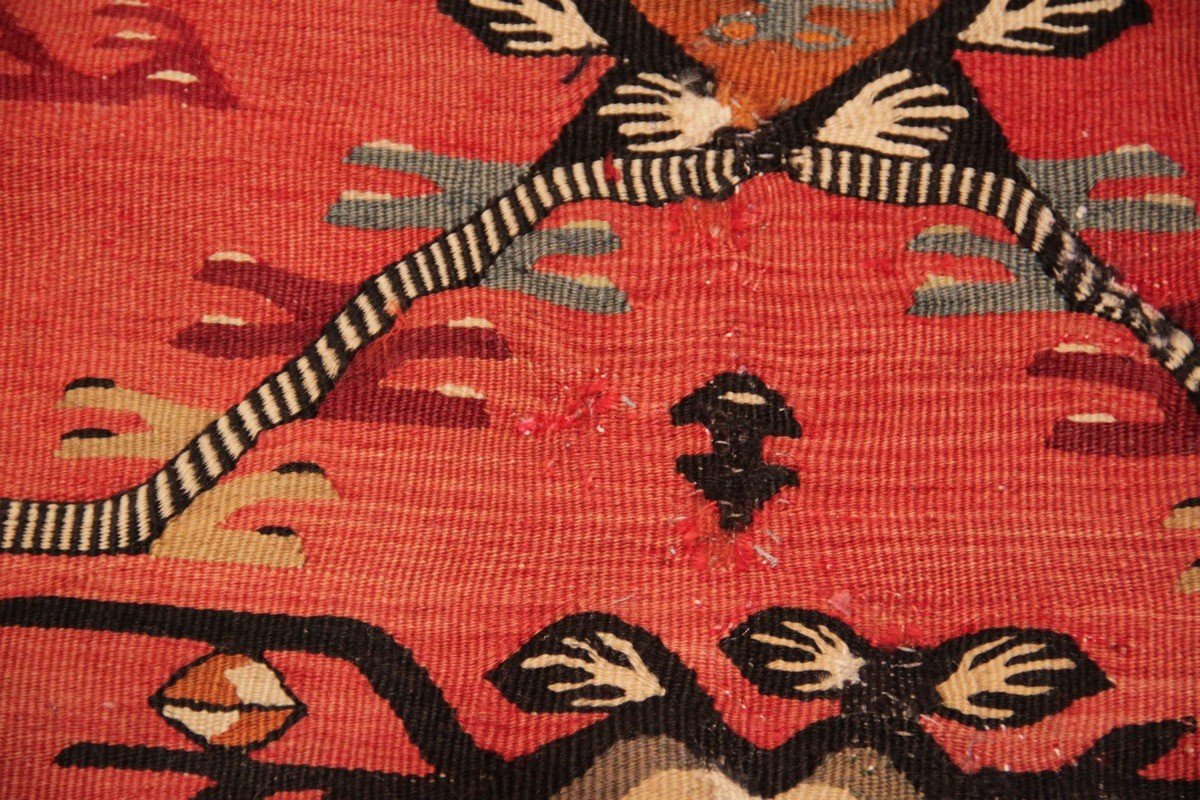 Splendide kilim Pirot au tissage très fin. La taille importante de ce kilim correspond à une demande européenne et ceci depuis la fin du XIX siècle. Le motif répétitif dans le champ du tapis est typique de cette origine. Une bordure claire contraste avec le rouge corail du champ du kilim.
