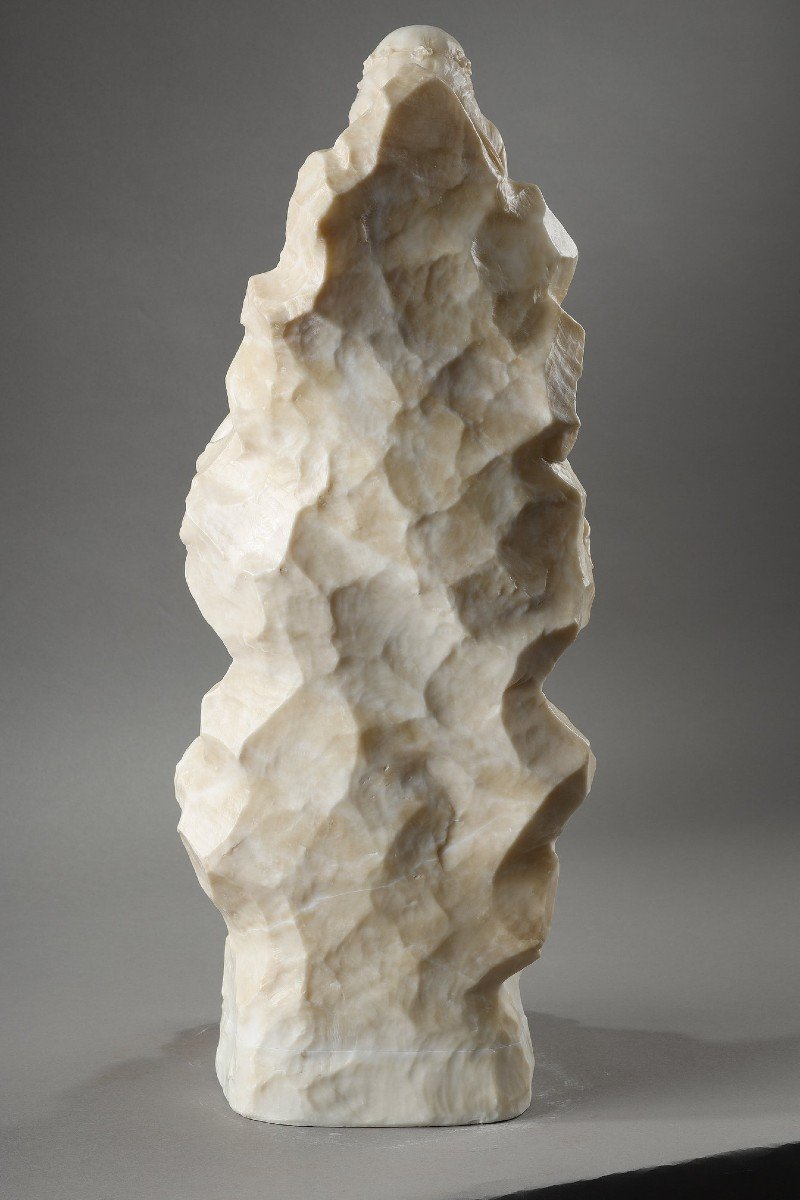 Sculpture en albâtre d'une jeune femme debout en appui sur un rocher dans une pose déhanchée et tenant une fleur près d'un rocher. Sculpture signée "G Gambogi" sur la base...