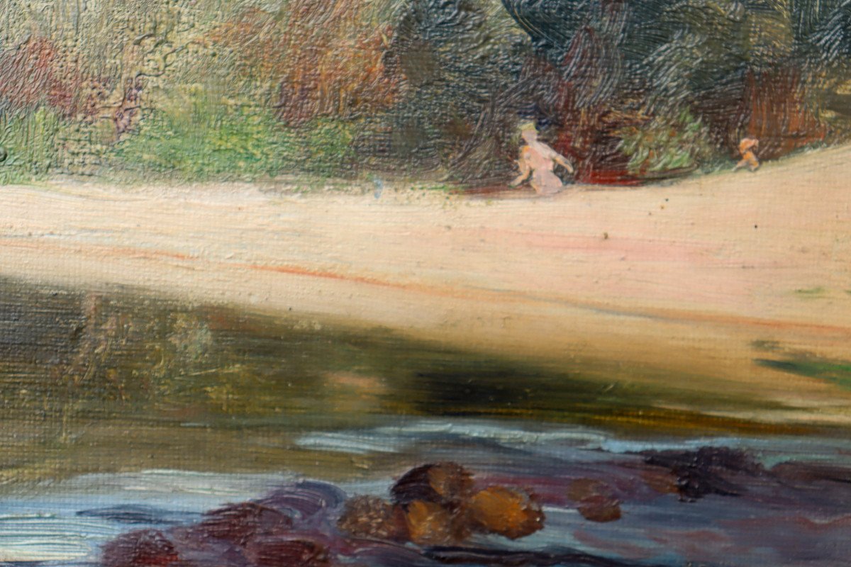 Il nous livre ici un méandre de rivière en été (le Gave de Pau ?) d’où une jeune femme ayant déposé ses vêtements s’apprête à aller se baigner…