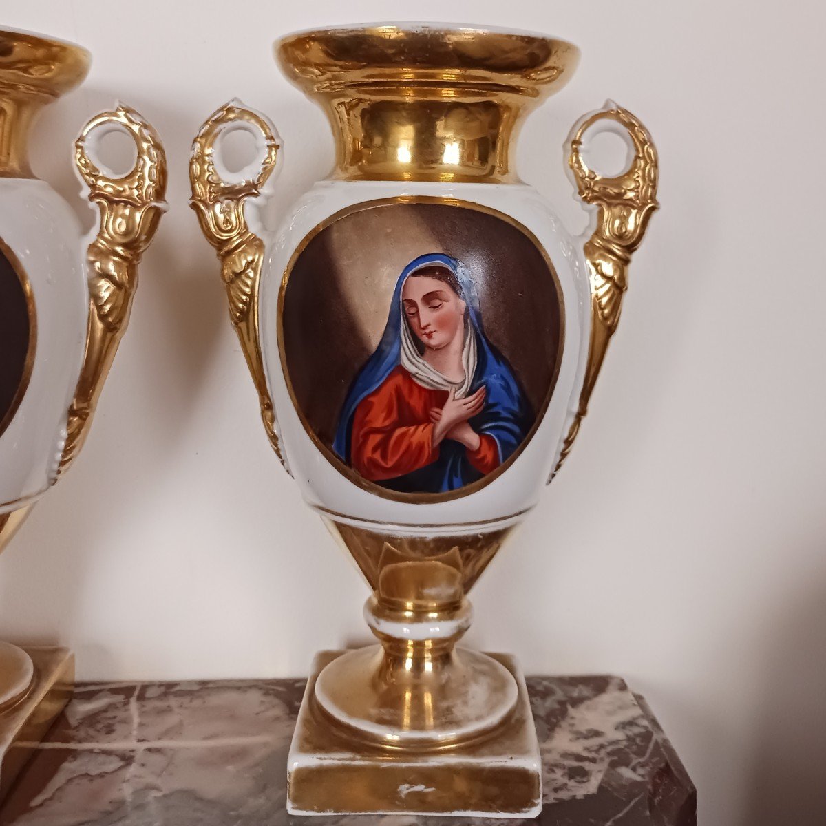 Deux vases balustres à anses à enroulement. Chacun à deux faces à thèmes chrétiens. L'avers montrant le Christ et la vierge, les revers monogrammés IHS (Iesus Hominum Salvator) et MA (Mater Amabilis). Probable élément lithurgique d'époque Restauration ou Louis-Philippe.