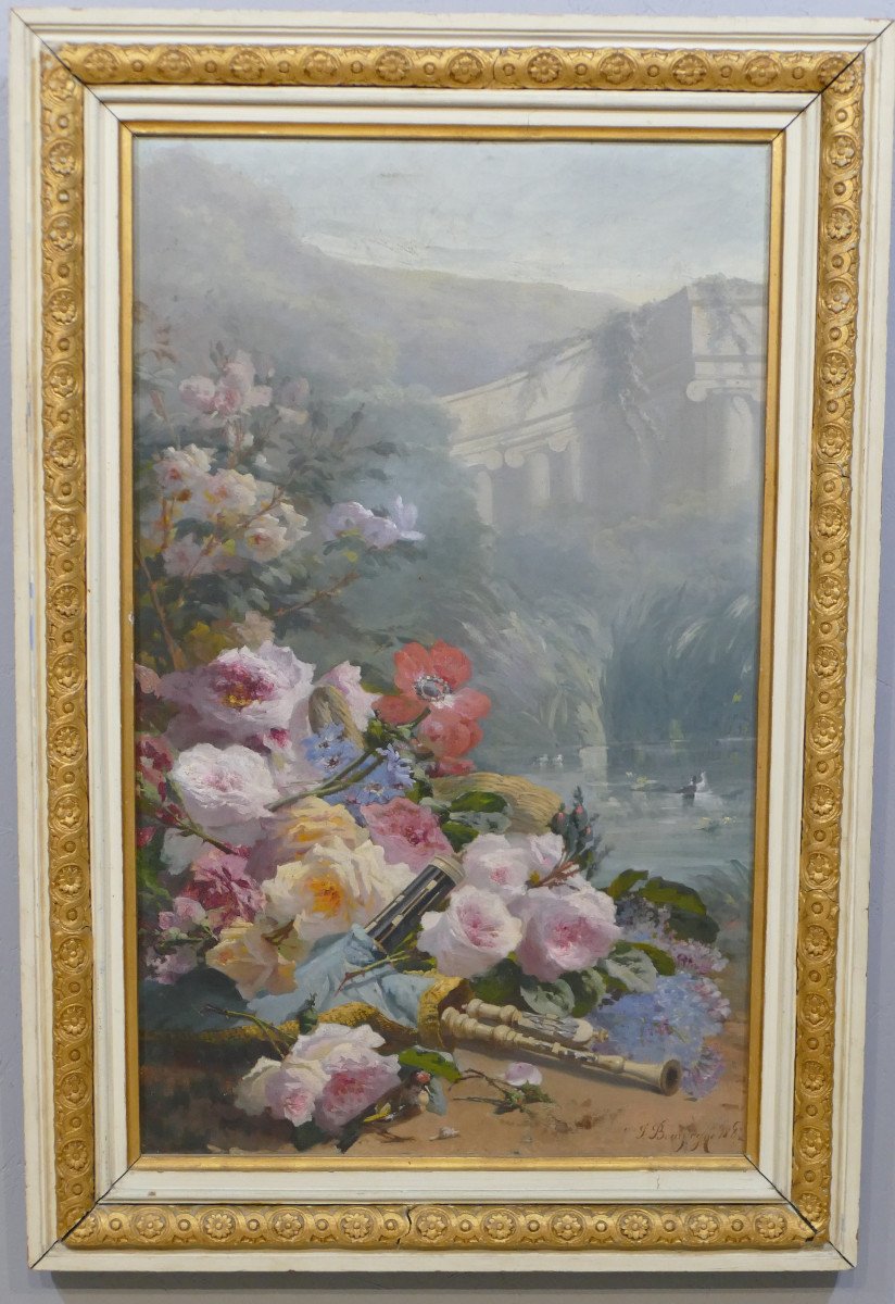 Grand tableau peint à l'huile sur toile représentant un jeté de fleurs aux instruments de musique dans un paysage de ruines à l'antique.
