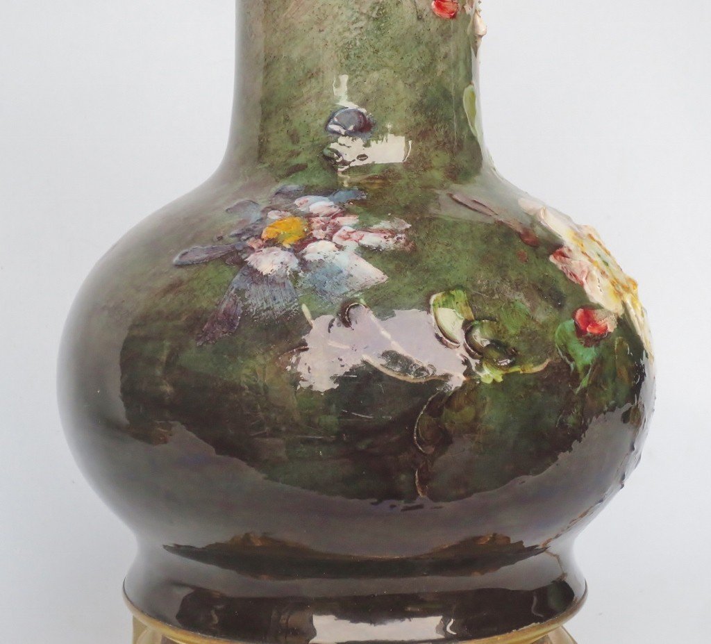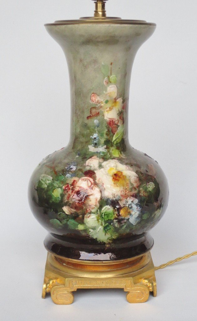 Ces très belle lampes en céramique, au décor appelé impressionniste, sont pleines de poésie, elles sont peintes, à la barbotine en émaux polychromes, de pensées et d'églantine sur un fond nuancé vert pale à vert foncé. Si il existe quelques grands centres à avoir réalisé cette sorte de faïence, Gien, Haviland ou encore Montigny-sur-Loing, il est bien difficile de les attribuer avec certitude, à l' une ou l' autre de ces manufactures, tant les artistes circulaient entre ces différents sites. Cependant celles-ci nous semblent très proches, par le traitement de la matière, de la production de Montigny-sur-Loing et peuvent provenir plus précisément de la manufacture d' Eugène Schoppin où travaillait Emmanuel Kilbert qui a produit des objets très proches de nos lampes et reproduit page 150 du livre d' Olivier Fanica et Gérard Boué intitulé : « Céramiques impressionnistes et Grès Art Nouveau. ». Sa riche monture en bronze doré, son décor dépouillé et les branches d' églantier illustrent le goût pour le japonisme de ce dernier quart du XIXe siècle qui annonce déjà l' Art Nouveau.