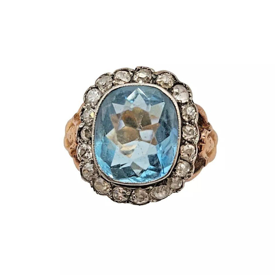La bague possède un anneau en or jaune orné de deux figures féminines et de motifs floraux ajourés. Ce superbe anneau Art Nouveau en or 18 carats, avec deux magnifiques nus drapés sculptés, est couronné par une aigue-marine de 4,7 carats et un ensemble de diamants. Elle est idéale pour une femme, taille USA 6 (taille L/M en France).