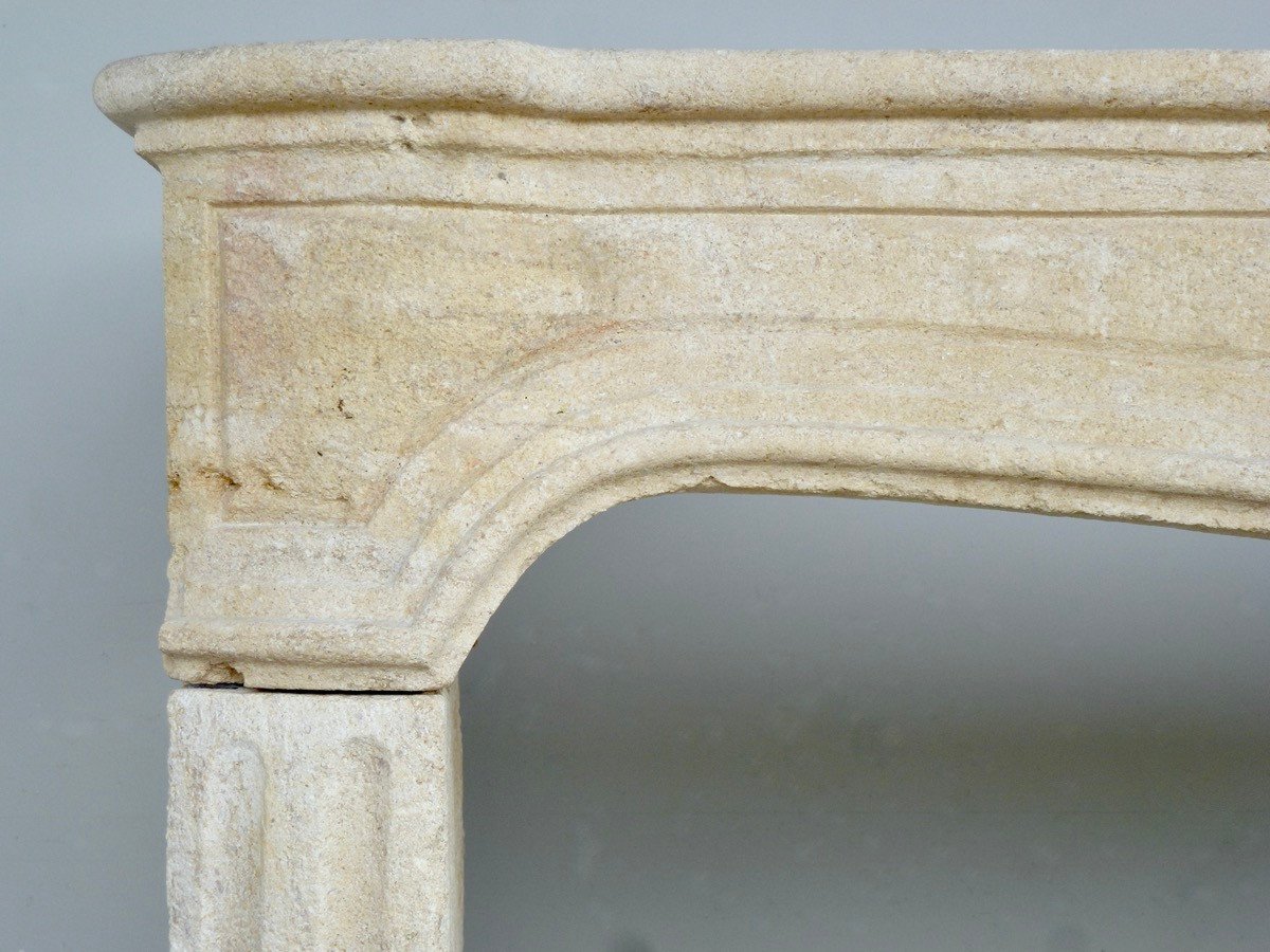 Cheminée en pierre de Lucenay, pierre extraite au nord de Lyon depuis l'antiquité, seule pierre blanche du Pays Beaujolais. D'époque XVIIIème siècle et de style Louis XV, cette cheminée est en parfait état d'origine. Son linteau légèrement galbé souligné d'un tore, sculpté d'une coquille symétrique en son centre accostée de réserves taillées en filet, repose sur des jambages en console agrémentés de canaux.