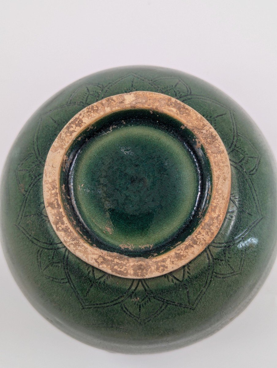 La glaçure verte, variant de l’olive au vert profond, est enrichie d’un réseau de craquelures naturelles et de patine ancienne, conférant à l’ensemble une authenticité visuelle remarquable.