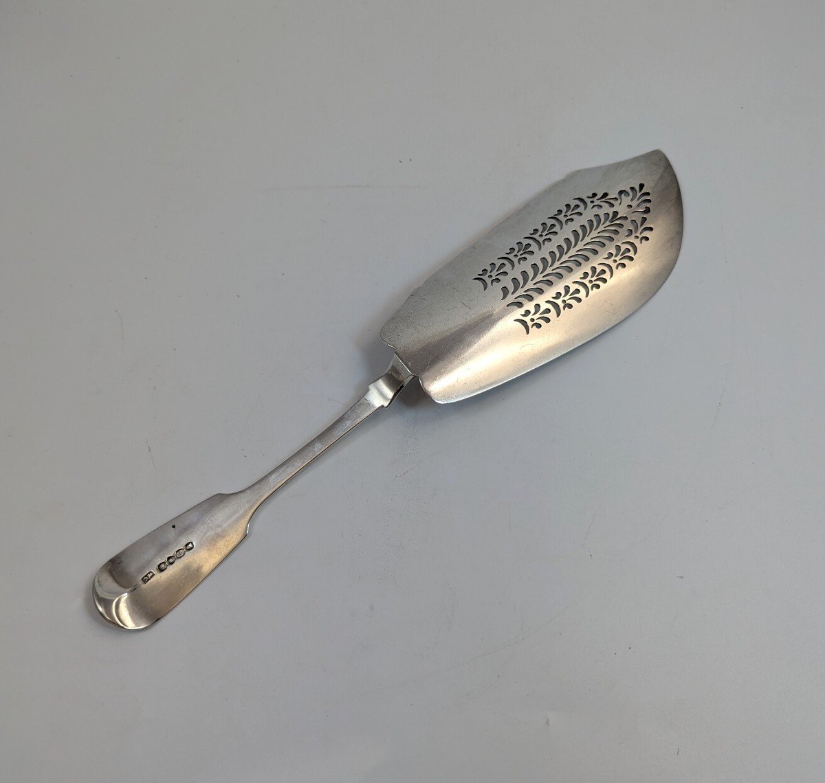 Pelle à poisson en argent massif Fiddle Thread par William Chawner II, Londres 1830Élégante pelle à poisson en argent massif datant du XIXᵉ siècle, réalisée par le célèbre orfèvre William Chawner II sous le règne de Guillaume IV. Cet élégant ustensile de table d’époque présente une lame finement ajourée avec un délicat travail de découpes en volutes et motifs floraux, un style de ciselure souvent désigné sous le nom de filigrane. Ce travail de découpe raffiné apporte non seulement un attrait esthétique, mais permet également d’égoutter l’excédent de jus lors du service du poisson.Le manche est gravé d'un monogramme représentant un coq, probablement lié aux armoiries d'une famille du Northumberland ou d'Écosse. Ce discret détail héraldique ajoute une dimension historique et une touche de caractère supplémentaire à la pièce.William Chawner II (1781–1834) est considéré comme l'un des plus grands fabricants de cuillers et fourchettes du début du XIXᵉ siècle à Londres. Le catalogue de modèles de son atelier a servi de référence pour de nombreuses créations victoriennes, consolidant son influence durable sur l’orfèvrerie anglaise.Entièrement poinçonnée pour Londres, 1830, et portant la marque du maître orfèvre William Chawner II.