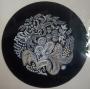 Modèle de broderie peint sur un tissus noir (soie?) en blanc et en jaune. Le tissus est signé en bas à droite Sichon. Il est encadré dans un cadre de la fin du XIXe siècle noir et doré à la vue, malheureusement un peu accidenté. Le tissus a pour diamètre 24,7 cm.
