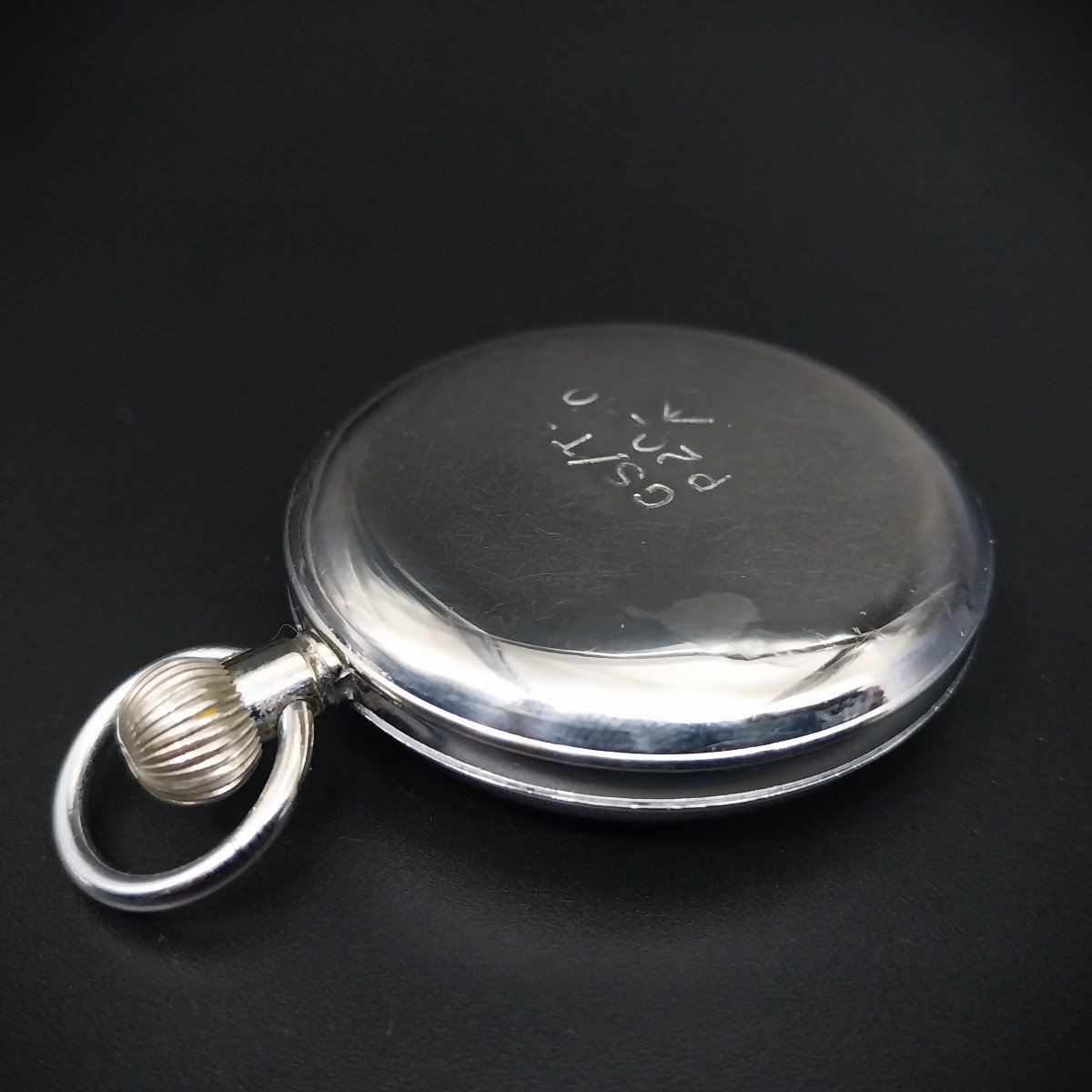 Montre gousset 19" fournie par Helvetia pour l’armée britannique avec des aiguilles lumineuses et cadran blanc, un boîtier en métal chromé avec fond à cliquet.