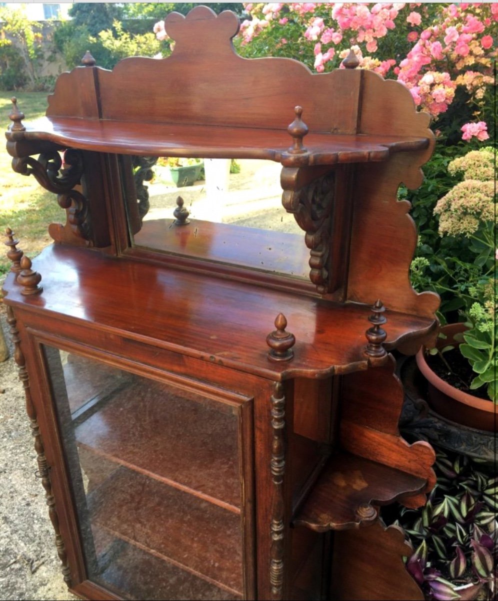Très jolie petite vitrine de présentation en acajou,À suspendre,Elle présente Une porte vitrée découvrantplusieurs étagères, ainsi que des compartiments sur lescôtés,