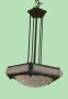Lustre en fer forgé martelé à patine brune de forme pentagonale comprenant une vasque centrale et cinq éléments semi-cylindriques en verre blanc moulé à décor de roses stylisées.