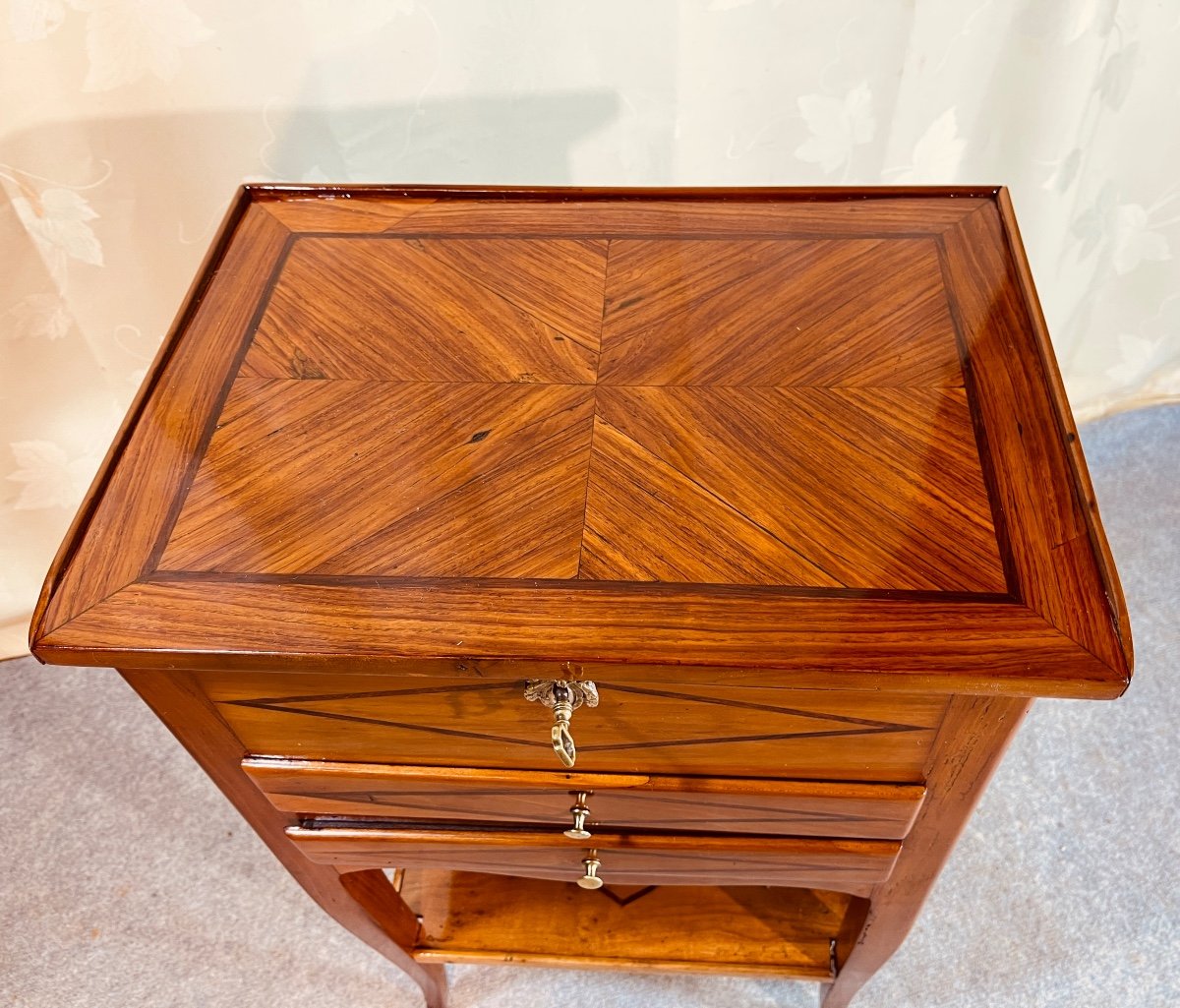 Elle campe sur des Pieds légèrement cambrés reliés par une Entretoise avec une Marqueterie de forme géométrique en Bois foncé .