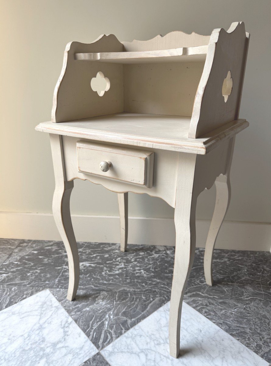Meuble en pin laqué mat coloris crème avec plateau supérieur et tiroir. Motifs « Quadrilobe » dans jouées chantournées. 4 pieds galbés. Peinture avec un effet « essuyé » sur les arrêtes.