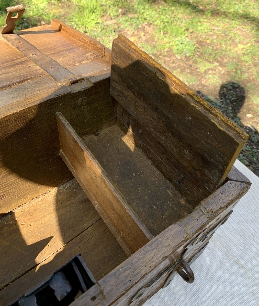 Etat: le bois est raviné et mangé (xylophages) par endroits mais dur à tous endroits, les pentures usées sur le fond (voir photos) mais parfaitement solides. Le petit coffre, très lourd a peut-être servi sur un navire, ce qui expliquerait son état actuel (sel).