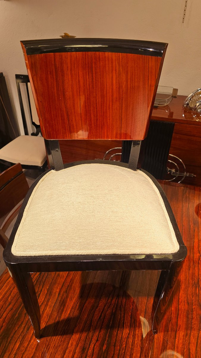 Suite de six chaises art deco en palissandre des indes et bois laqué noir Entièrement restaurée assise et bois Tissus à choix ici en démonstration Livrable gratuitement par mes soins