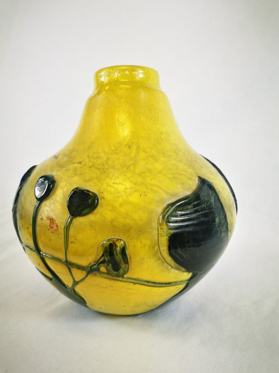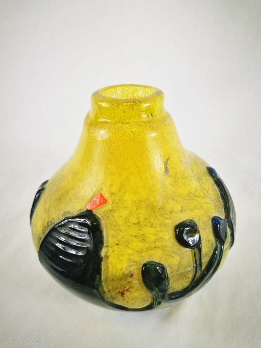 Vase du maitre verrier JC Novaro . Il travaillait à BIOT. Grand ami de Johny Hallyday.( Cf video YouTube ) https://www.youtube.com/watch?v=4hB6buptwVI&pp=ygUcamMgbm92YXJvIGV0IGpvaG55IGhhbGx5ZGF5IA%3D%3DJean-Claude NOVAROCe vase est signé et daté 1997JC NOVARO est passionné dès son plus jeune et sa notoriété se construit doucement d'abord à Paris avec le grand succès da la lampe qui s'éclaire en haut en bas en même temps. Son atelier se trouve à Biot dans lequel il travaille sur des nouvelles techniques notamment l'inclusion d'or et d'argent dans ses oeuvres. Puis il ouvre une galerie dans le bas de son atelier. C'est en 1987 qu'il connait son plus grand succès lors d'une exposition aux Musée des Arts Décoratifs pendant laquelle quatre de ses pièces ont été sélectionnées par Jack Lang. Il est alors sollicité dans le monde entier: Japon, Belgique, Etats Unis.