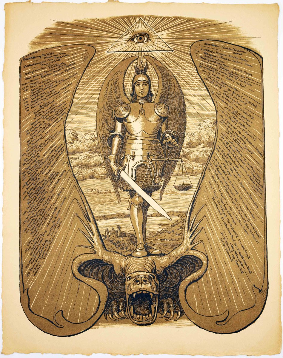Sûrement inspiré par le tournant du siècle, qui est toujours une allégorie du cycle des temps, Hans Thoma créa en 1902 son "Calendrier perpétuel". Dans cette œuvre, ce n'est pas la séquence des chiffres qui est au premier plan, mais le phénomène cyclique des planètes, dont chaque caractère détermine les signes du zodiaque. Bien que le calendrier soit réalisé dans une monochromie aux teintes terreuses, les couleurs jouent un rôle essentiel, comme le montre la première feuille, intitulée "Soleil". Ici, les couleurs sont représentées par des putti vivants, qui rendent hommage au soleil avec des fleurs nourries par sa lumière. En bas à gauche, un schéma universel inspiré du cercle chromatique de Philipp Otto Runge montre que le calendrier est également une théorie artistique de la création.