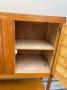 Élégant buffet haut en bois massif, au design épuré et fonctionnel, typique du style des années 1950-60 de Pierre Gautier Delaye modèle "weekend " édition Vergnères. Ce meuble est composé de 3 portes à ouverture intégrée, révélant un bel espace de rangement intérieur. La structure repose sur quatre pieds ronds et une étagère basse, parfaite pour exposer des objets ou ajouter du rangement.