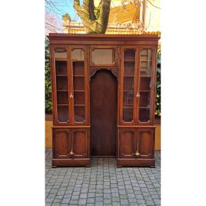 Bibliothèque « pont » raffinée en noyer massif, avec serrures et clés à deux pans.