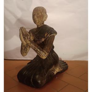 Élégante et précieuse sculpture en bois peint, ornée de détails en verre et en pierre. Elle représente un moine tibétain agenouillé, les mains jointes en prière. Son visage, empreint de sérénité, est rasé de près. La robe qui l'enveloppe est peinte en noir, rehaussée de précieux détails en or, de verre et de pierres scintillantes. Cette sculpture, d'un goût et d'un raffinement exceptionnels, apportera une touche d'élégance et d'authenticité orientale à tout intérieur. Artisanat oriental, probablement birmane, fin du 19ème siècle.