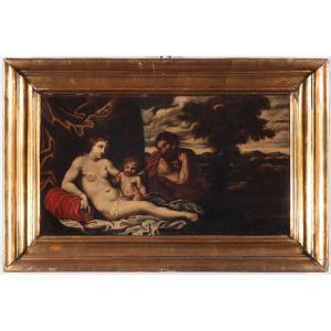 Giovanni Andrea Podestà (Gênes, vers 1608 – 1673), attribué à, Jupiter et Antiope, huile sur toile, dimensions 38x65 cm, avec cadre 53x81 cm.