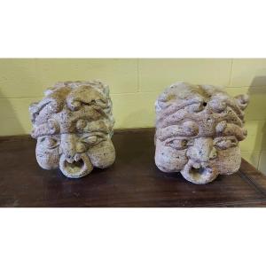 Paire d'éléments sculptés anciens, originellement issus d'une fontaine. Réalisés en pierre calcaire, ils présentent un motif décoratif avec des visages, caractéristiques d'un style architectural classique. Conservation avec une patine originale