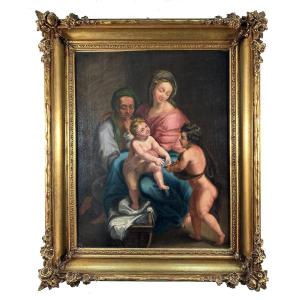 Le tableau représente l'un des sujets les plus chers à la tradition picturale chrétienne : la Sainte Famille avec l'Enfant saint Jean-Baptiste (dit « Giovannino »). Les quatre figures sont disposées selon un motif pyramidal classique, héritage direct de l'influence de Raphaël, lui-même influencé par le classicisme du XVIIe siècle. La Vierge, au centre de la composition, tient l'Enfant Jésus sur ses genoux ; derrière elle, une figure âgée – identifiable comme sainte Anne – observe la scène d'un regard pensif et attentif. À droite, le jeune saint Jean-Baptiste, reconnaissable à la ceinture ornée d'une ceinture d'animaux, tend la main vers l'Enfant, lui offrant un fruit ou un petit objet dans un geste de dévotion et d'affection enfantines.