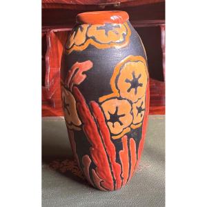 Ce modèle présente une silhouette harmonieuse, légèrement galbée, reposant sur une base discrète et s’évasant subtilement vers un col court à lèvre soulignée d’un émail brun chaud. Le décor, traité en fort contraste, se compose de larges motifs floraux stylisés et de feuillages élancés dans des tonalités rouge corail et jaune ocré, se détachant sur un fond noir mat profond.