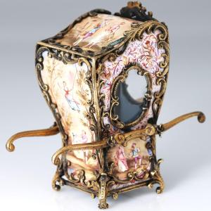 Portantine décorée d’une fine peinture en émail polychrome représentant des scènes galantes. La porte s’ouvre pour révéler un siège garni de tissu bleu. Poinçonnée d’une tête de lion et de la lettre A, marque de garantie pour les petits objets en argent 750/1000 utilisée à Vienna entre 1867 et 1922. Marque de fabricant : LP.