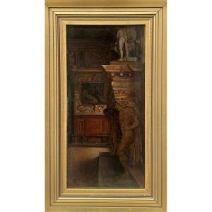 Huile sur toile, signée et datée 1885 ; au revers est conservée une ancienne étiquette imprimée portant le nom J. T. Hansen avec l’inscription en danois « Kamin i Dogepaladset i Venedig », confirmant le sujet représenté.