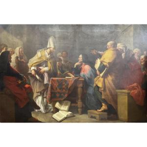 Grande huile sur toile représentant "Saint Augustin combattant l'hérésie face à Félix le manichéen"